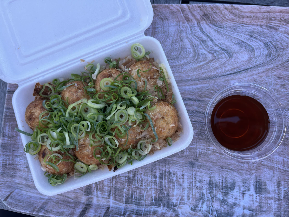 たこ政特製のたこ焼きにネギをトッピングして、大根おろしとポン酢のソースにつけて食べるスタイルにしてもらいました!