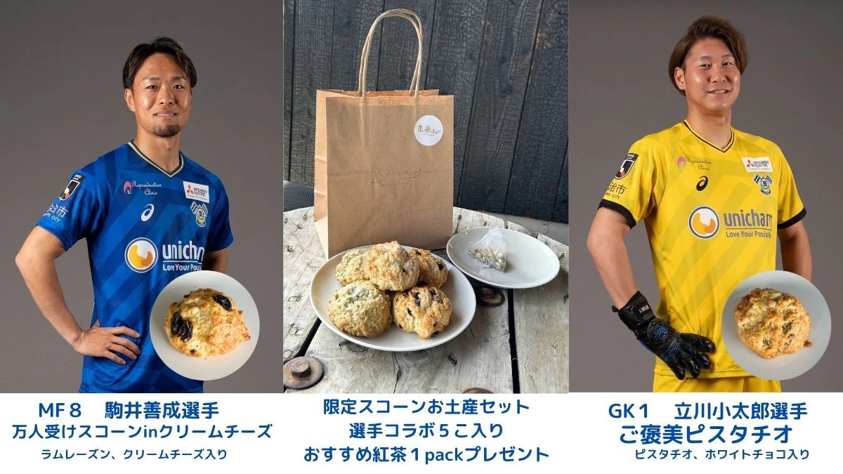 選手コラボのスコーンが登場!駒井選手の「万人受けスコーンinクリームチーズ」は、ラム酒が香るスコーンの真ん中にクリームチーズが入っている、大人が喜ぶ仕上がりに。立川選手の「ご褒美ピスタチオ」は、ピスタチオがたっぷり入った食べ応えのあるスコーン。両選手のスコーンが計5こ入ったスコーンお土産袋には、里山サロンおすすめの紅茶を1packお付けします。