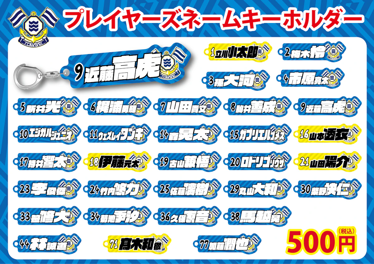 選手の名前を漢字やカタカナで表現したアクリルキーホルダー。