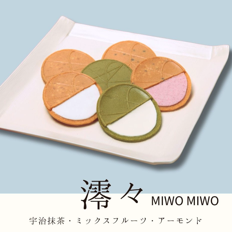 東大阪の名店、播彦おすすめの「澪々」は、宇治抹茶・フルーツ・アーモンドを練り込んだ3種類のおせんべいに、それぞれ異なる味のクリームやチョコレートをサンドした洋風せんべいです。