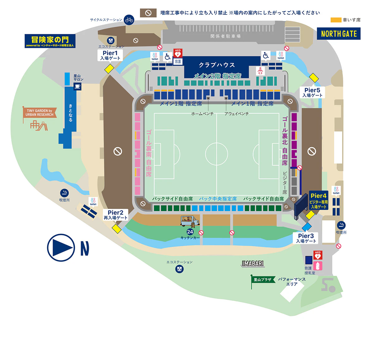 なお、工事に伴い、試合日の冒険家の門付近に設置しておりました、エコスエーション、救護テント、授乳テントは撤去しております。下記図面をご確認くださいませ。