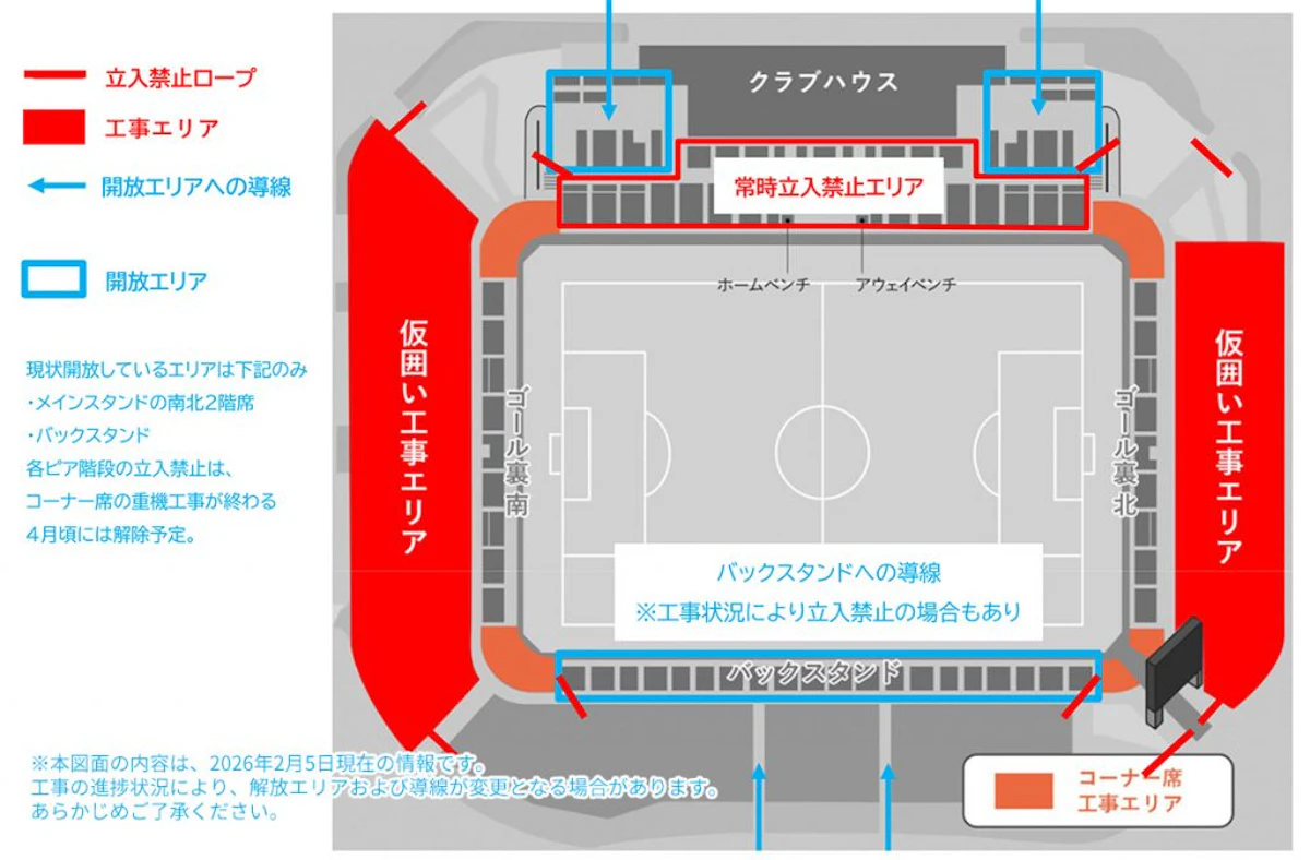 現在、工事の進行に伴い、スタジアム内の一部エリアにおいて立入禁止区域の設定および導線の変更を行っております。