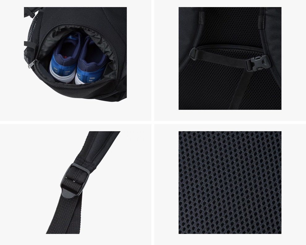 メインの収納に加え、貴重品を収納できるファスナーポケットを上部に配置し、シューズや汚れ物を入れられるコンパートメント、