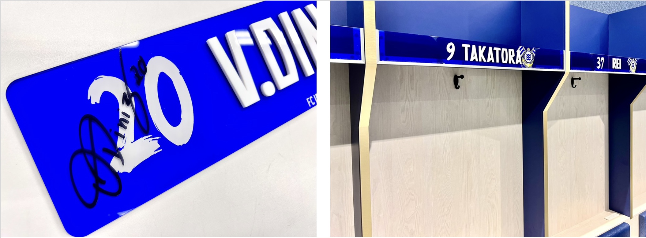 アシックス里山スタジアム、ホームロッカーで使用された選手の銘板に、直筆のサインが入っています。