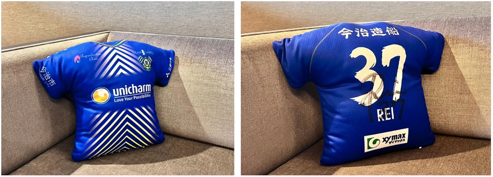 貴重な選手の直筆サインが入ったユニフォーム型のクッション。