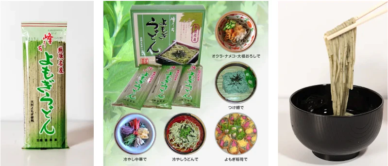 よもぎうどんは天然の国産よもぎと山芋をつなぎに風味をそこなう事無く製造したよもぎ麺の逸品です。