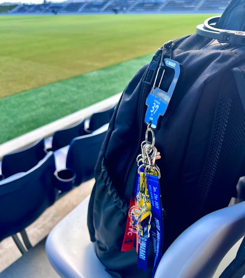 選手のユニフォームがたなびくようにプリントされたアクリル製カラビナ。