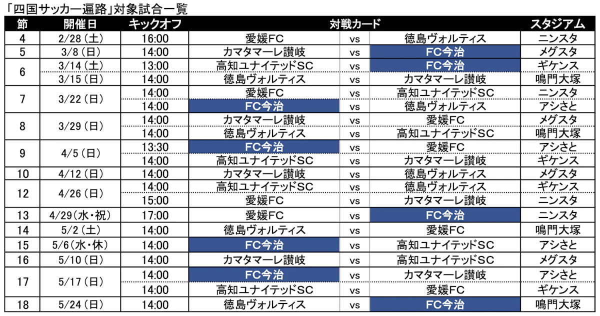 この特別大会におきまして、四国クラブ同士の試合を単なる「対戦」だけでなく、「交流」や「巡り合い」も楽しめるものにしていきたい。そうした想いのもと、四国5クラブで連携し、百年構想リーグ期間中に、『四国サッカー遍路』と題したさまざまな企画やトークイベントを開催いたします。