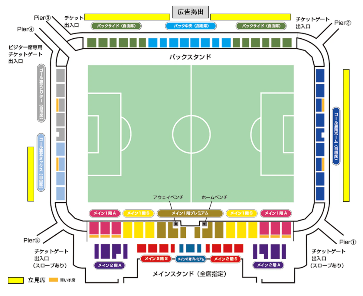 ※立見席の設置エリアは以下図表をご覧ください。立見席での観戦ルールは、バックスタンド、ゴール裏南ホーム、ゴール裏北ミックスの各観戦ルールに準じます。詳細は以下をご覧ください。