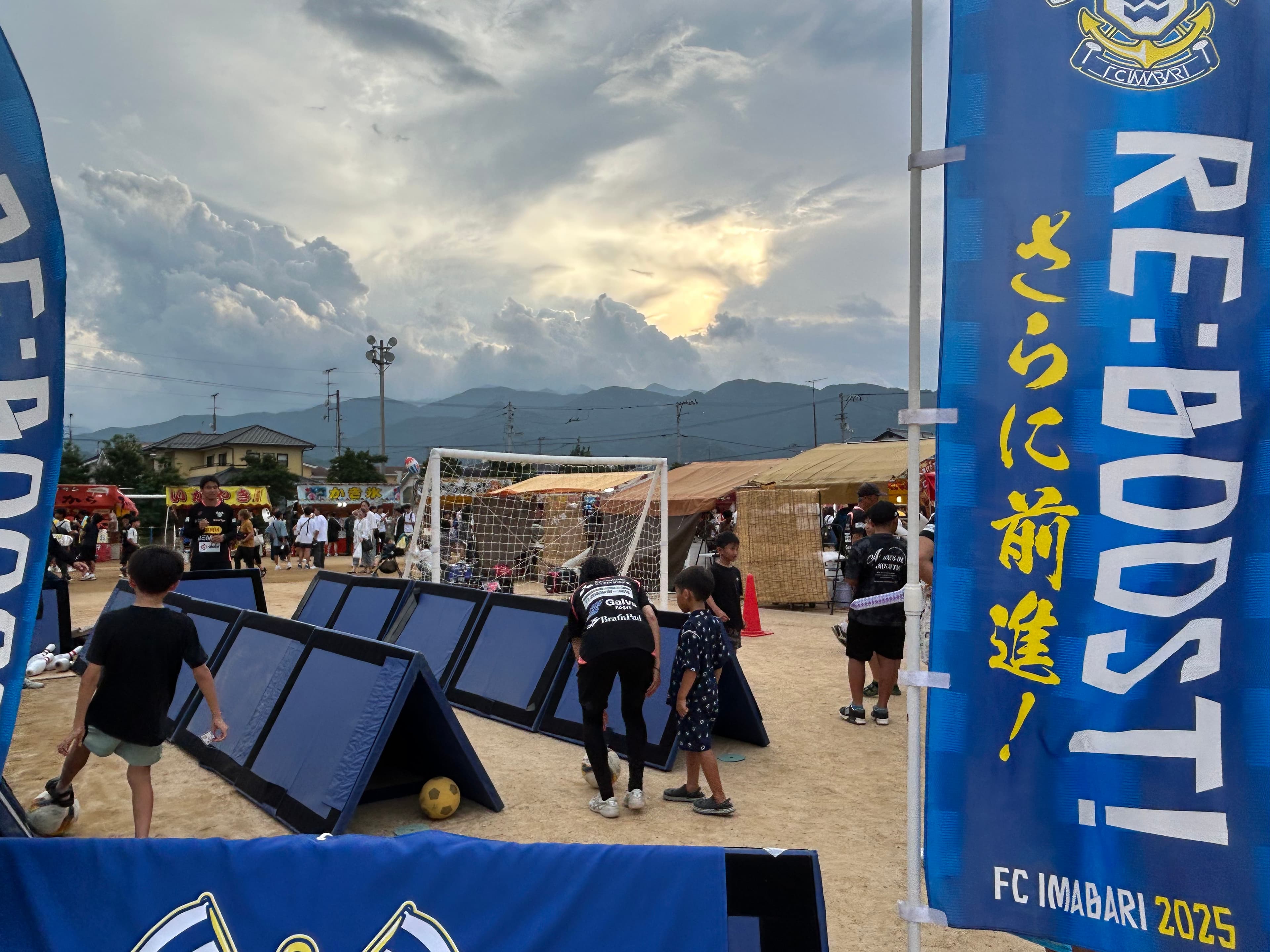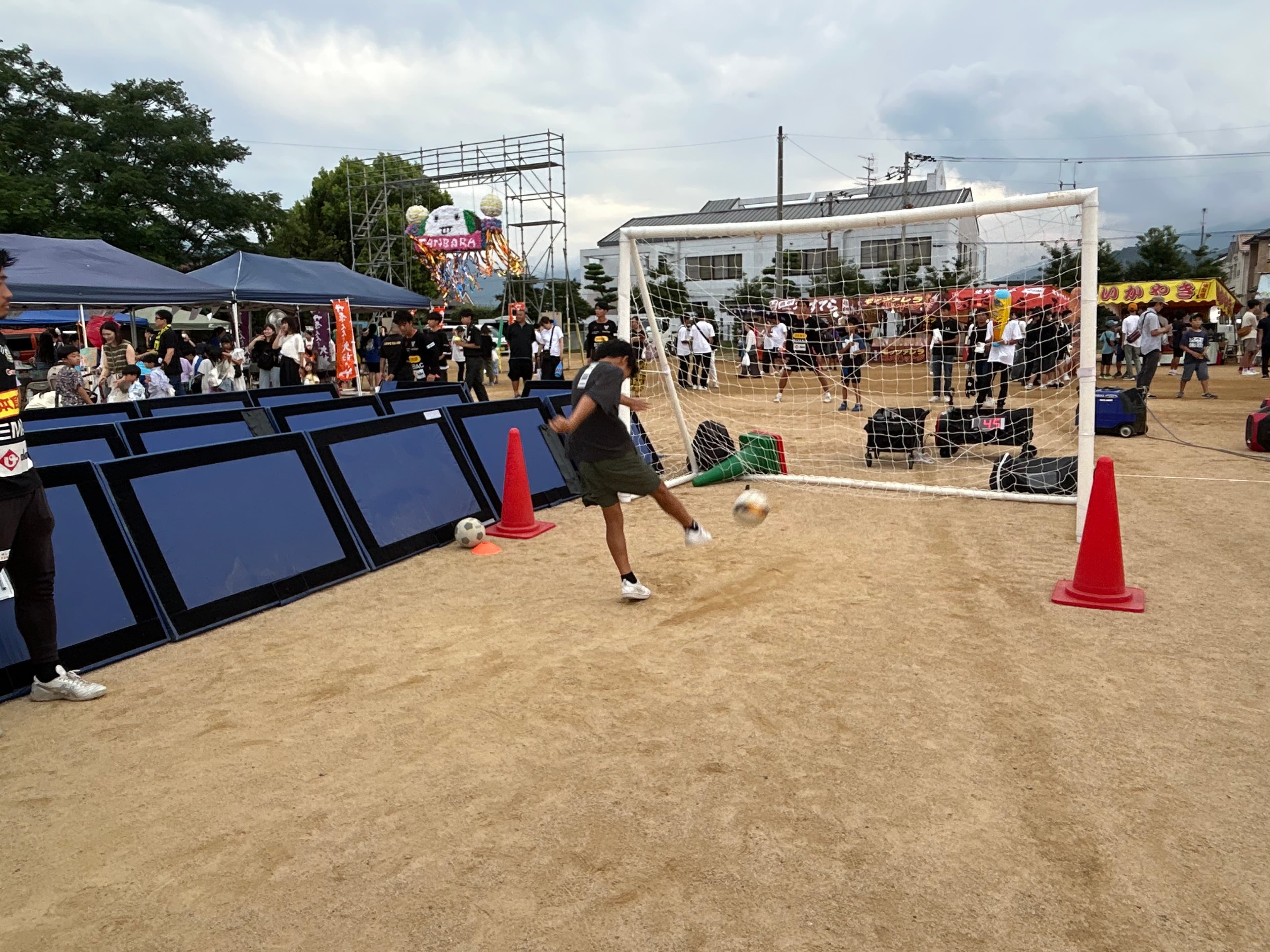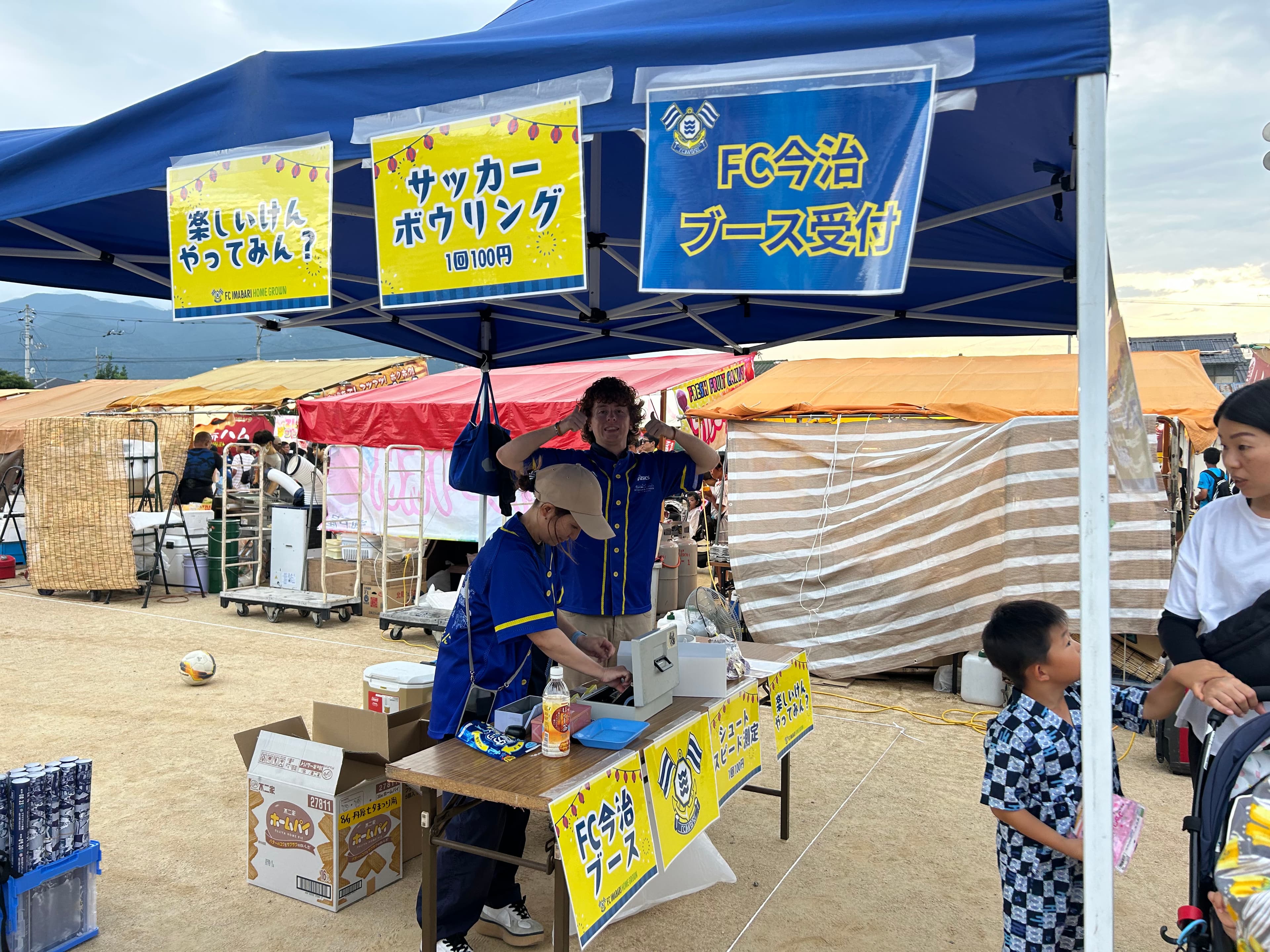 FC今治の地域コラボチーム(略して「ちいコラ」)と連携し、8月7日に西条市丹原で開催された「丹原七夕夜市」にサッカーボウリング&シュートスピード測定ができるブースを、ホームグロウンのコーチたちが出店しました!