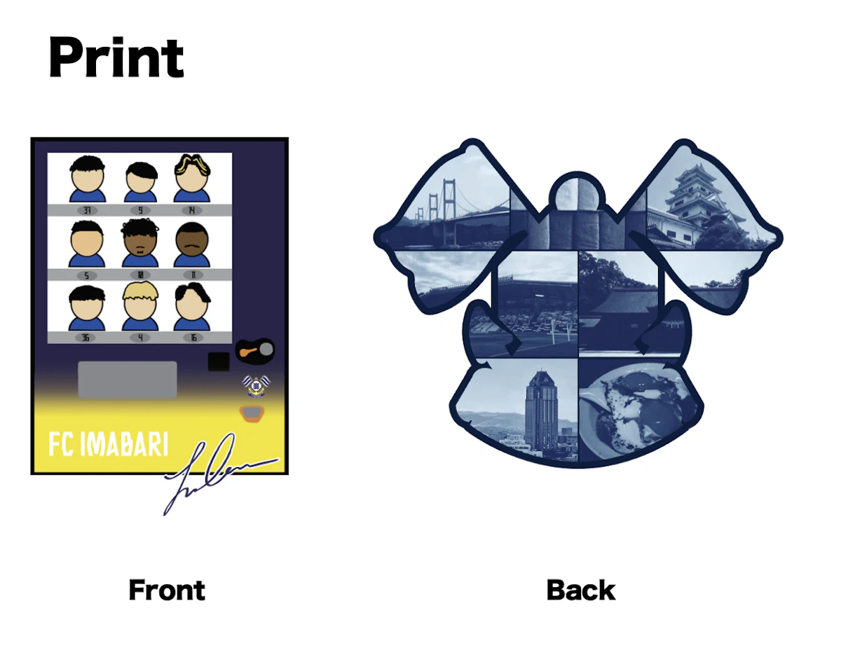 ルーカス君が日本に来て驚いたことの一つは、自動販売機の多さと豊富な種類でした。これはルーカス君に限らず日本に来た海外の方は皆一様に驚かれます。この日本で独特な進化を遂げた自動販売機をテーマに、彼のFC今治でお気に入りの選手を組み合わせるという奇抜なアイディアがフロントプリントに。
