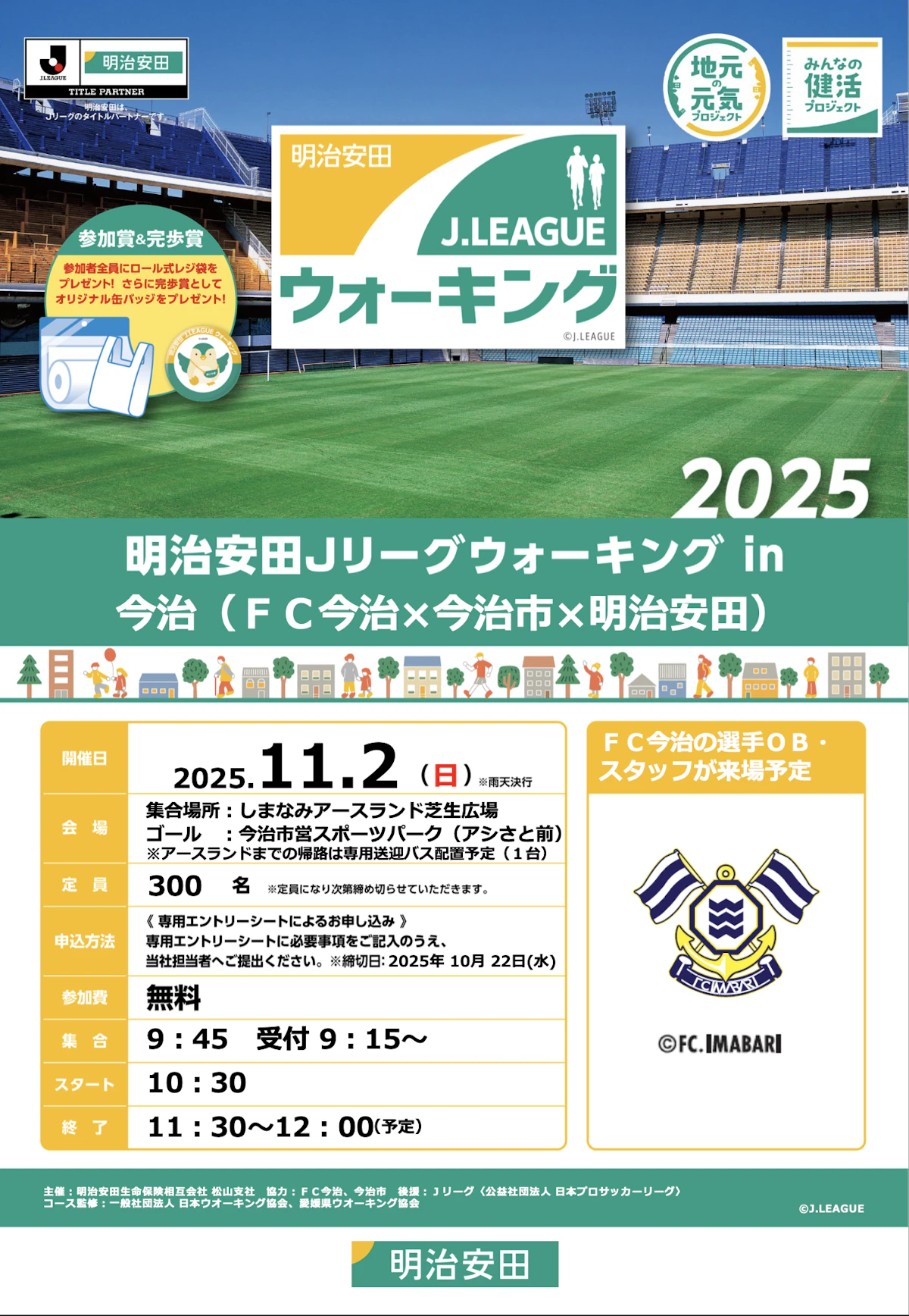 11月2日(日)に、JリーグのタイトルパートナーでJクラブパートナーでもある明治安田様と共同で、ウォーキングイベント「Jリーグウォーキング」を実施いたします。 つきましては、現在同イベントの参加者を募集中です。