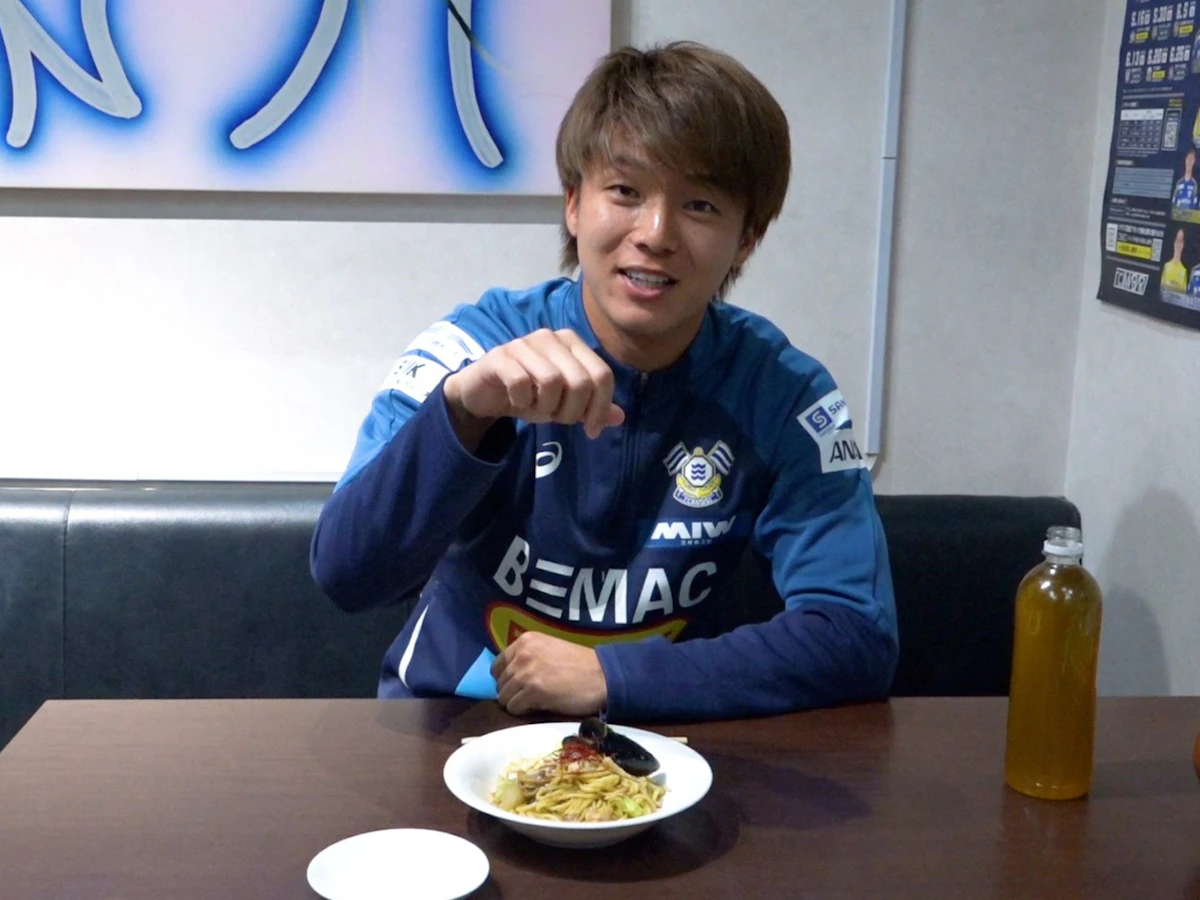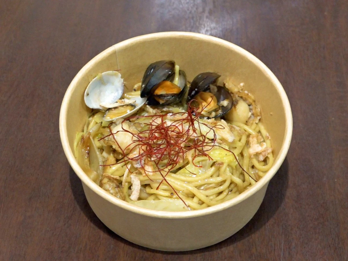 孫選手が好きな貝類(あさり、ホタテ、ムール貝)を使用した焼きそば。塩ベースでニンニクやフライドオニオンが効いた一品で、岩塩を振りかけてお楽しみください!