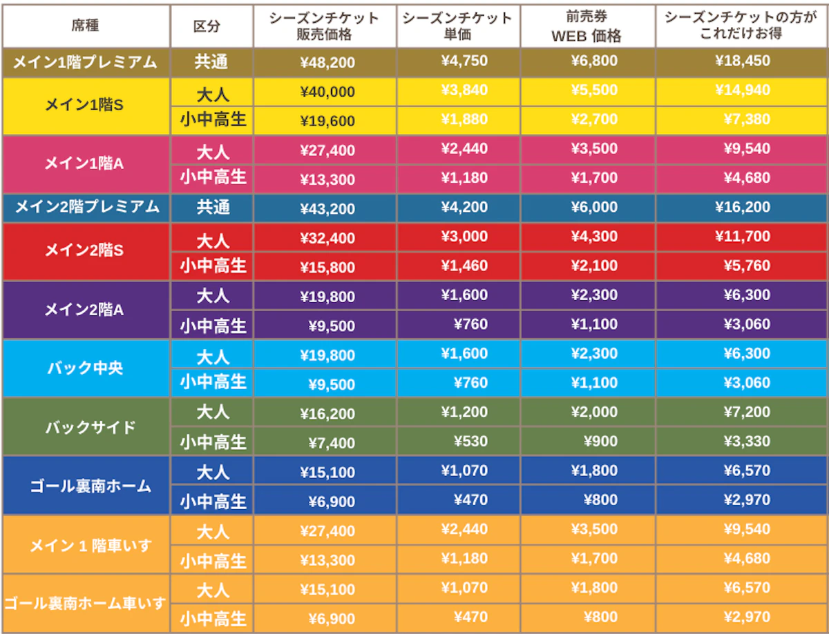 ※シーズンチケットの表示価格は、ファンクラブ年会費(大人5,400円/小中高2,600円)込み、税込み価格となります。