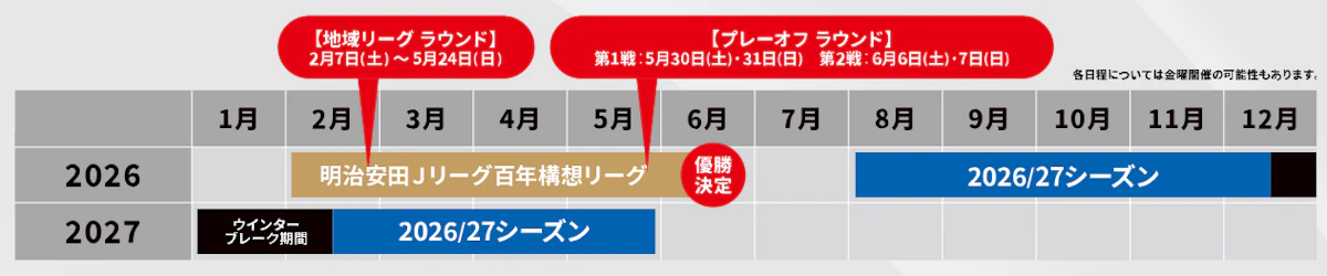 来シーズンは、Jリーグのシーズン移行に伴い、2026年2月から同年6月まで開催する特別大会「明治安田Jリーグ百年構想リーグ」を経て、2026月8月~2027年5月(予定)に「2026/27シーズン」が開催されます。