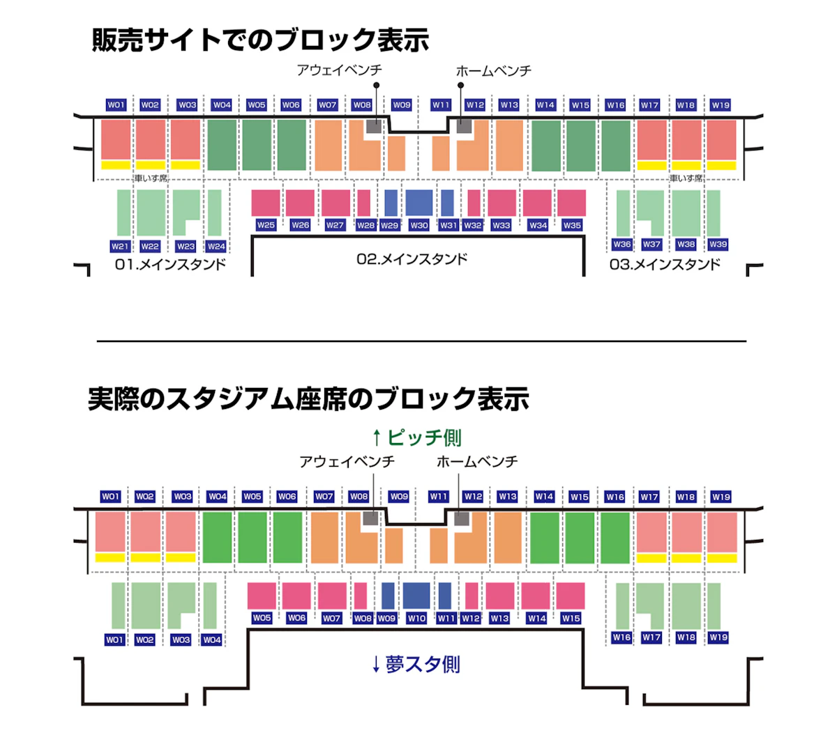 チケット販売サイトで表示されるメインスタンドのブロック名は、販売サイトシステムの都合上、全てのブロックが違う番号となっておりますが、実際のブロック番号は、1階2階と共通になっております。