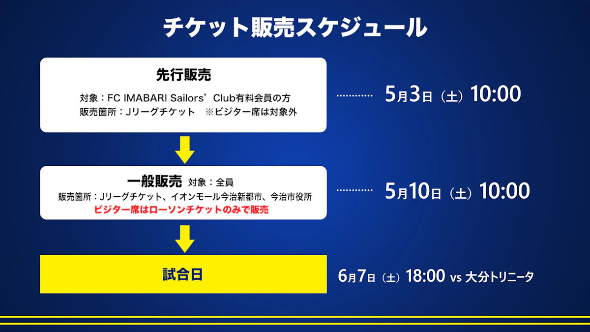 今治市役所 13階福利厚生会 | 5月12日(月)8:30〜 6月6日(金)17:15 | ゴール裏のみ販売 指定席販売なし |