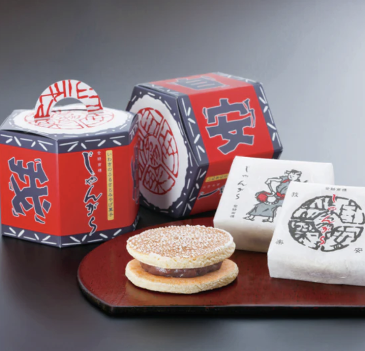 じゃんがらの太鼓を模した和菓子で、水を加えない生地を焼き大納言餡を挟んだ甘い和菓子です。