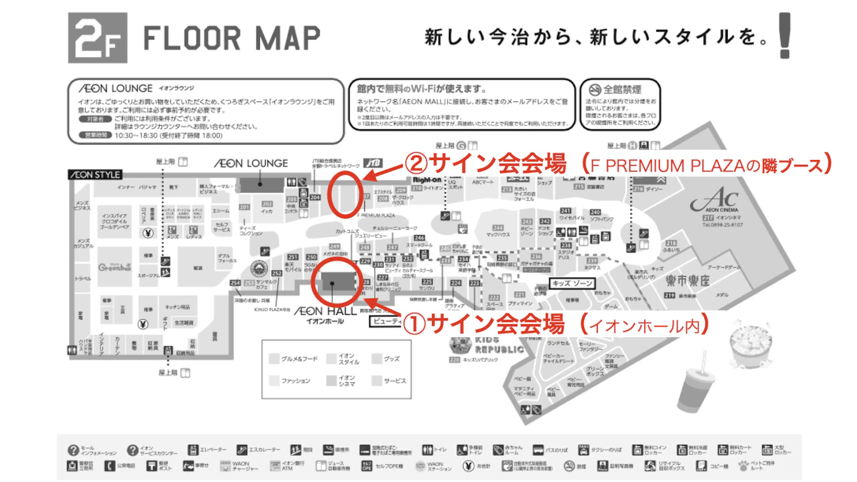 選手は「イオンホール」「F PREMIUM PLAZAの隣ブース」2グループに分かれて、同時並行にサイン会を行います。特定の選手に並んでもらう形ではなく、並んでいる参加選手全員に、順番にサインをもらう流れとなります。