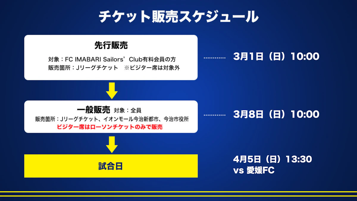 今治市役所 13階福利厚生会 | 3月9日(月)10:00~ 4月3日(金)17:15 | ゴール裏のみ販売 指定席販売なし |