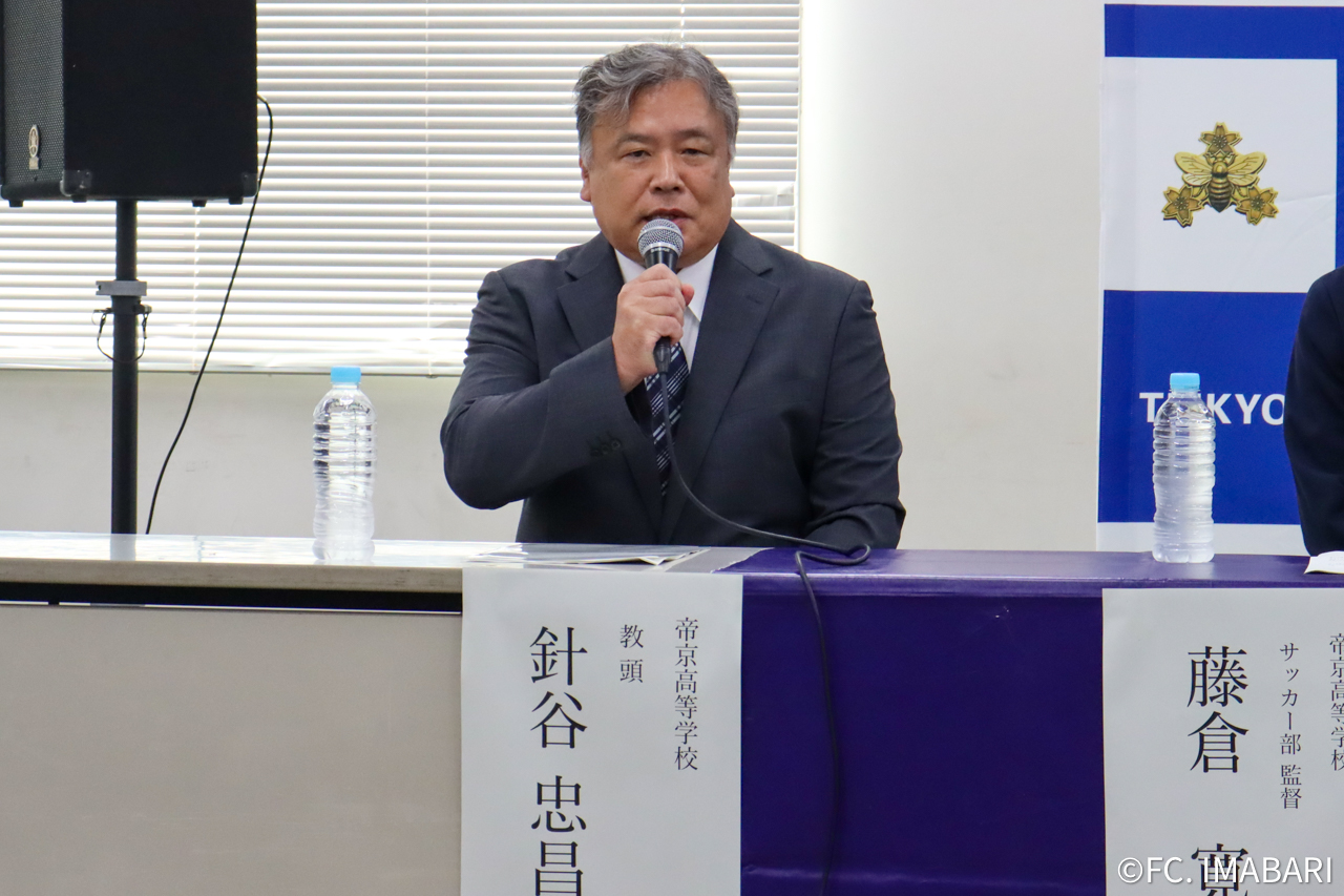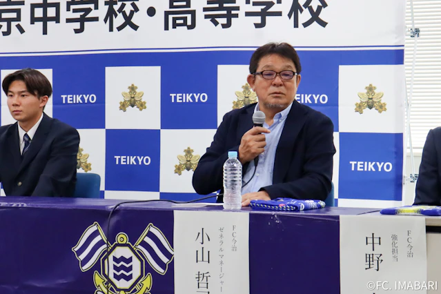 記者会見には、 FC今治への加入が内定している久保 恵音選手、帝京高等学校 針谷 忠昌教頭、 藤倉 寛サッカー部監督、 そして、当クラブよりゼネラルマネージャーの小山 哲司、強化担当の中野 圭が登壇しました。