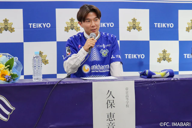 この度、2026シーズンからFC今治に加入することになりました、帝京高校の久保 恵音です。小さい頃からの目標だったプロサッカー選手を、FC今治という素晴らしいチームでスタートできることを嬉しく思います。1年目から出場し、横山 夢樹くんや梅木 怜くんのように活躍して、FC今治のチームの勝利に貢献できるように頑張ります。