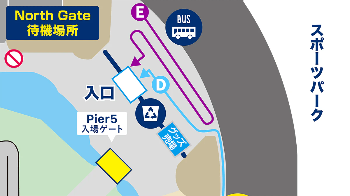 ビジターサポーターの方は、下図の通り、【North Gate(ビジター側ゲート)】側D・Eの2列にお並びいただきます。