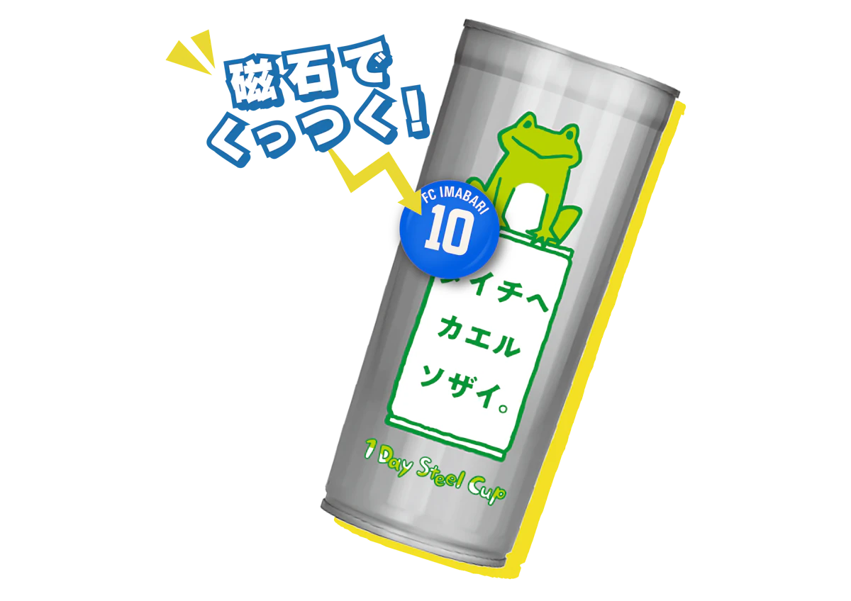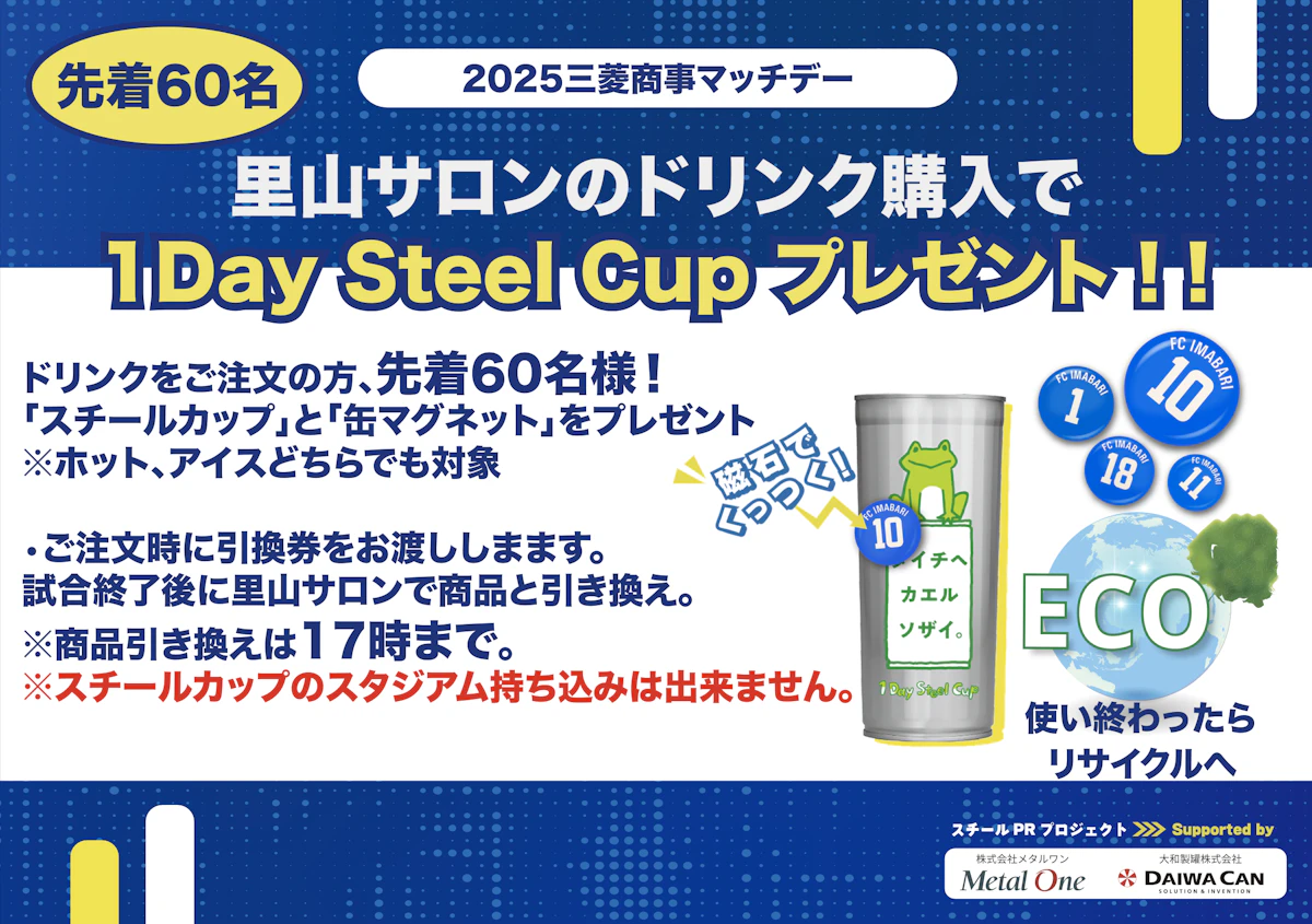 三菱商事グループ会社メタルワンは大和製罐と連携し、資源循環と環境保全をテーマに、サステナブル素材「スチール」で作られた“カエルちゃんカップ”と”缶マグネット”(非売品)を里山サロンで先着60名様にプレゼントしていただきました。