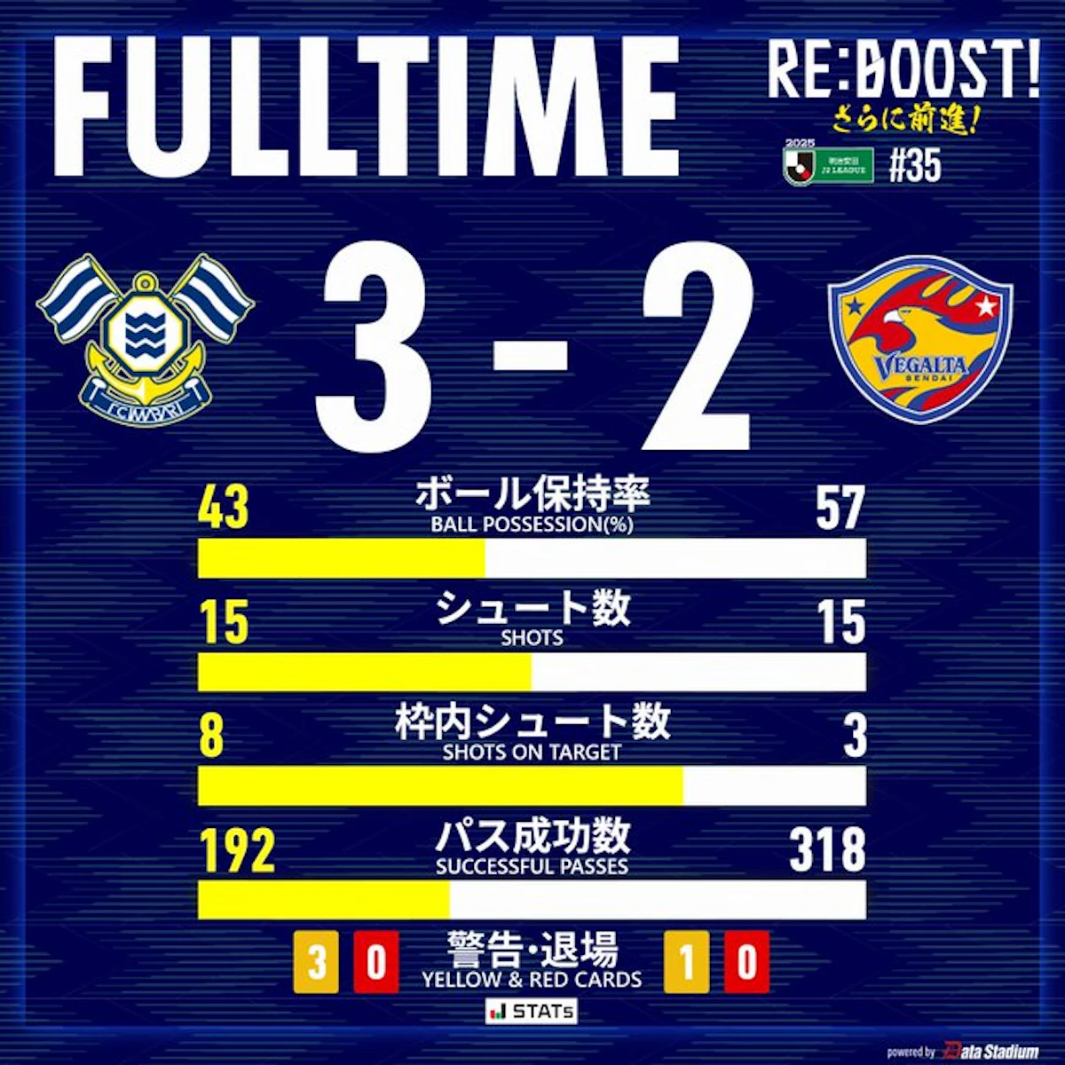 試合は前半7分に、仙台に先制点を許す苦しい立ち上がりとなりましたが、選手たちはすぐに切り替え反撃を開始。前半11分、#41 安井拓也選手が鮮やかな連携から同点ゴールを押し込み、試合を振り出しに戻します。さらにこの勢いのまま、#10 マルクス・ヴィニシウス選手が躍動。前半21分にヘディングで逆転弾を決めると、前半37分にも再びゴールネットを揺らし、エースとして圧倒的な存在感を発揮。前半を3-1と優位な形で折り返しました。