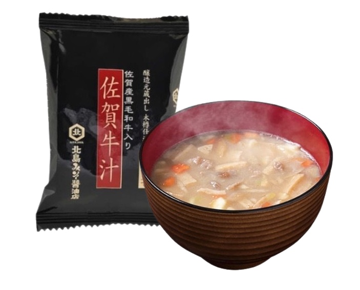 明治30年創業の老舗「北島味噌醤油店」自慢の味噌と、佐賀県産黒毛和牛の深い「味わいとコク」をフリーズドライにし、お湯を注ぐだけで簡単にお召し上がれます。また、ご飯の上に乗せてお湯をかけ雑炊風にしても美味しくいただけます。