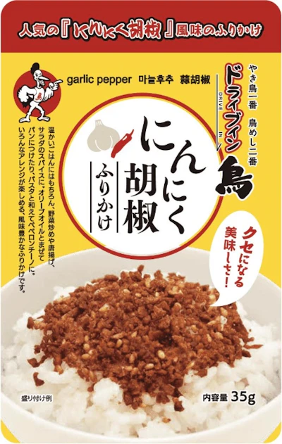 ドライブイン鳥で大人気のにんにく胡椒をふりかけにアレンジ。ふりかけとしてだけでなく、パスタや野菜炒めなど様々な料理のアレンジにも!