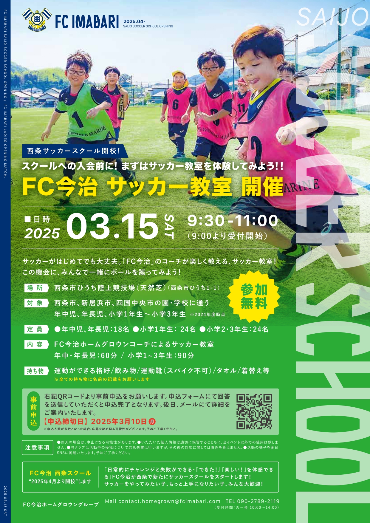 この度、FC今治 西条スクール開校に向けて、3月15日(土)に開催される2025プレナスなでしこリーグ2部FC今治レディースvs吉備国際大学Charme高梁の前座イベントとして、『FC今治サッカー教室 in 西条』を行います。