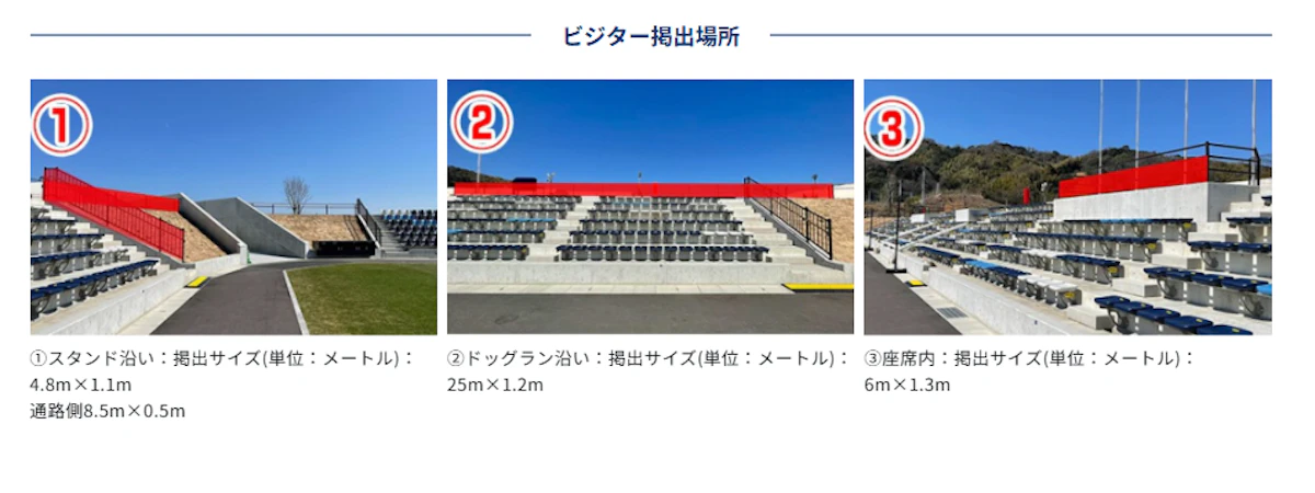 掲出可能な場所は以下の図面をご確認ください。図面に記載された場所以外での掲出は禁止となります。横断幕を掲出される場合は開場後1時間以内での設置にご協力ください。ビジター席の増減により、ホーム、ビジターの応援幕の掲出場所は変更となりますのでご注意ください。