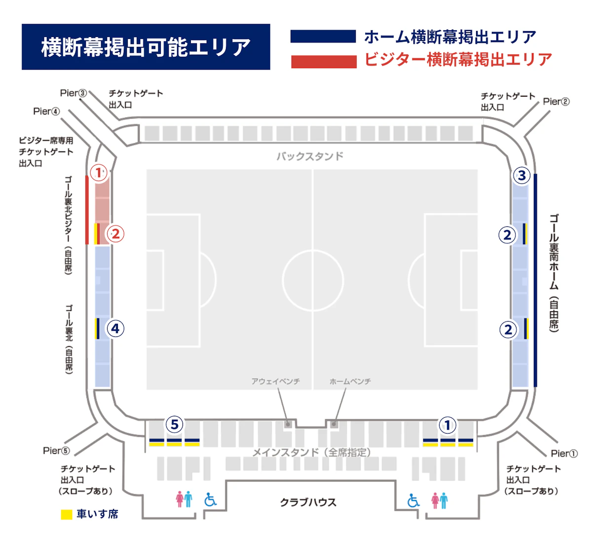 掲出可能な場所は以下の図面をご確認ください。図面に記載された場所以外での掲出は禁止となります。横断幕を掲出される場合は開場後1時間以内での設置にご協力ください。ビジター席の増減により、ホーム、ビジターの応援幕の掲出場所は変更となりますのでご注意ください。