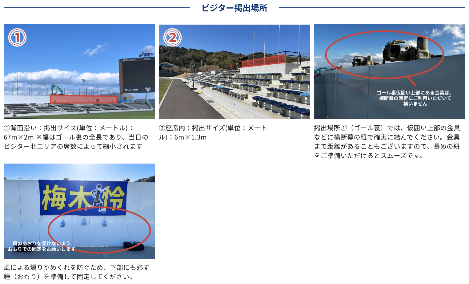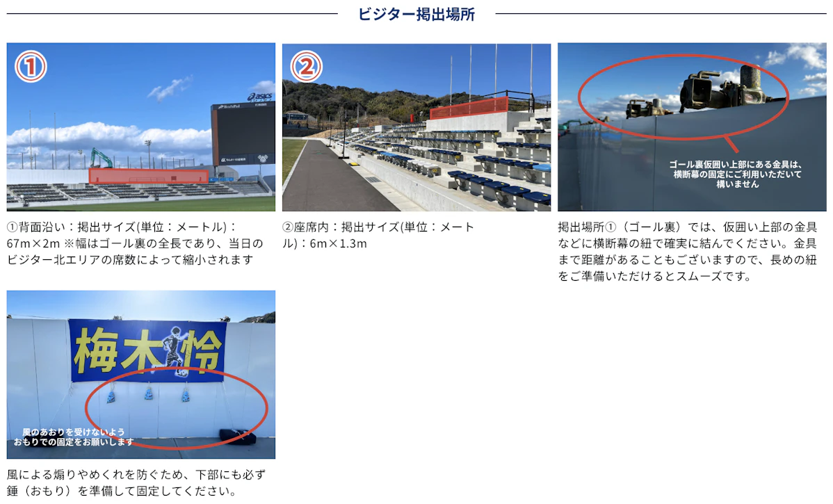※ゴール裏車いす席前の柵に掲出する場合は、車椅子席での観戦環境に配慮し、最上段の柵に幕を巻き付けないようにしてください。