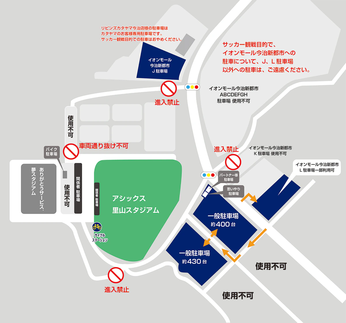 イオンモール今治新都市L駐車場は当該施設のお客様および従業員の皆さまがご利用されている駐車場です。当該施設のお客様および従業員の皆さまと、ご観戦者の皆さまの駐車エリアを分けて運用することで、双方のご利用者が円滑に駐車いただけるように、変更させていただきました。