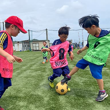ボールを止める、蹴る、運ぶなどサッカーを楽しむために必要な技術を身に付けます。